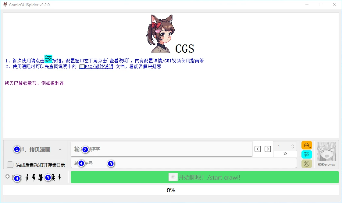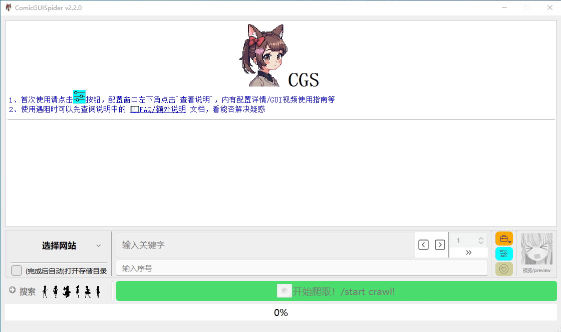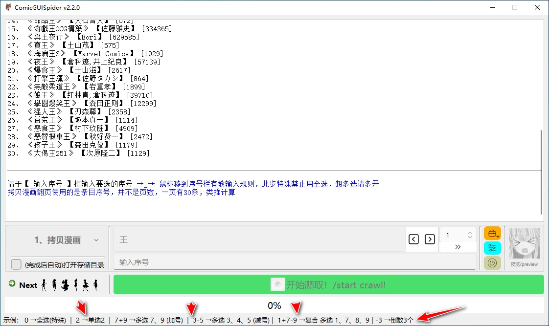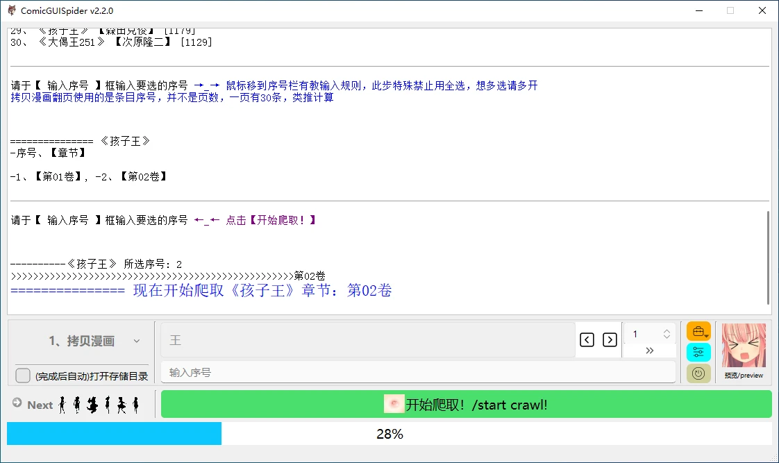 简单的说,步骤就是先搜索关键词,找到关键词列表,然后输入对应的序号下载对应的漫画,针对漫画再次输入其中需要下载的章节,最后点击「开始爬取」按钮即可进行下载了。