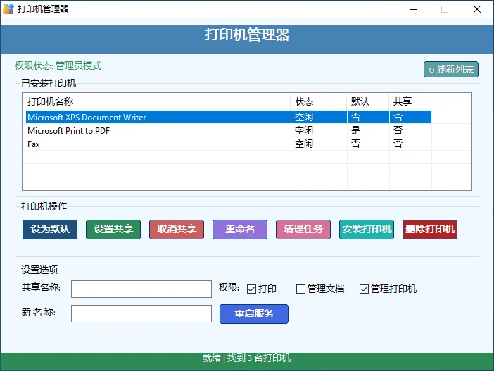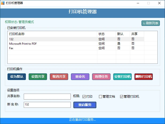 进行任何操作之前需要先选中你需要操作的打印机对象,比如我想给上图中选中的打印机重命名,则需要选中打印机之后在下方「新名称」后面的输入框中输入,最后点击重命名按钮,最后点击重启服务即可看到打印机的名称已经修改了: