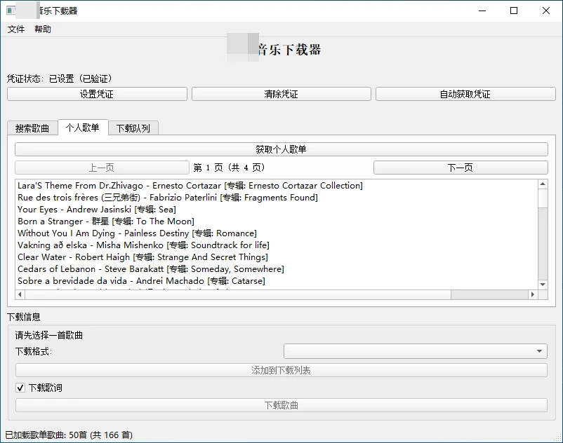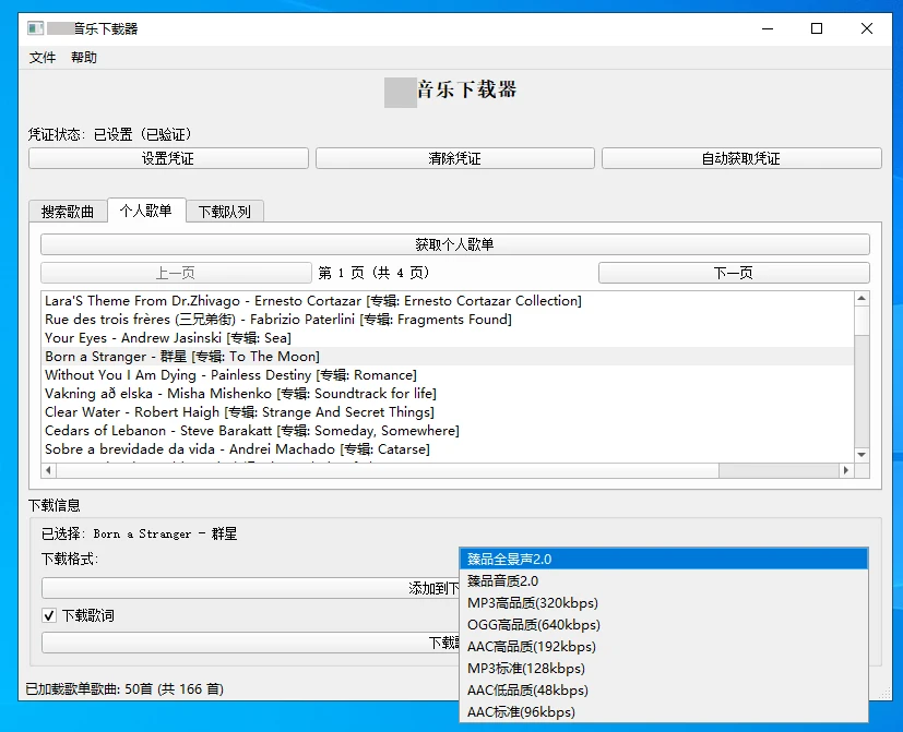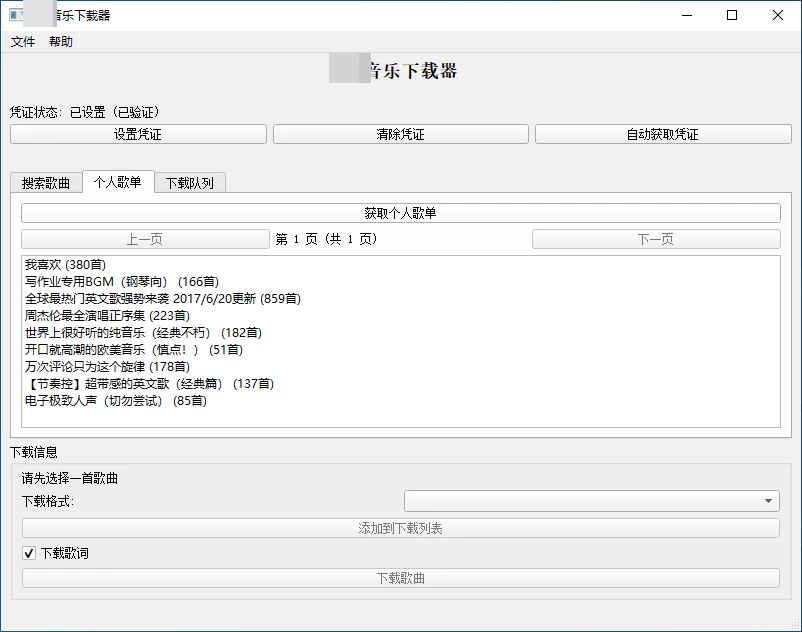 双击歌单中的任意一首歌曲即可选择歌曲,为后续下载做准备,同时在软件下方可以看到你所选歌曲的相关信息以及支持的下载格式: