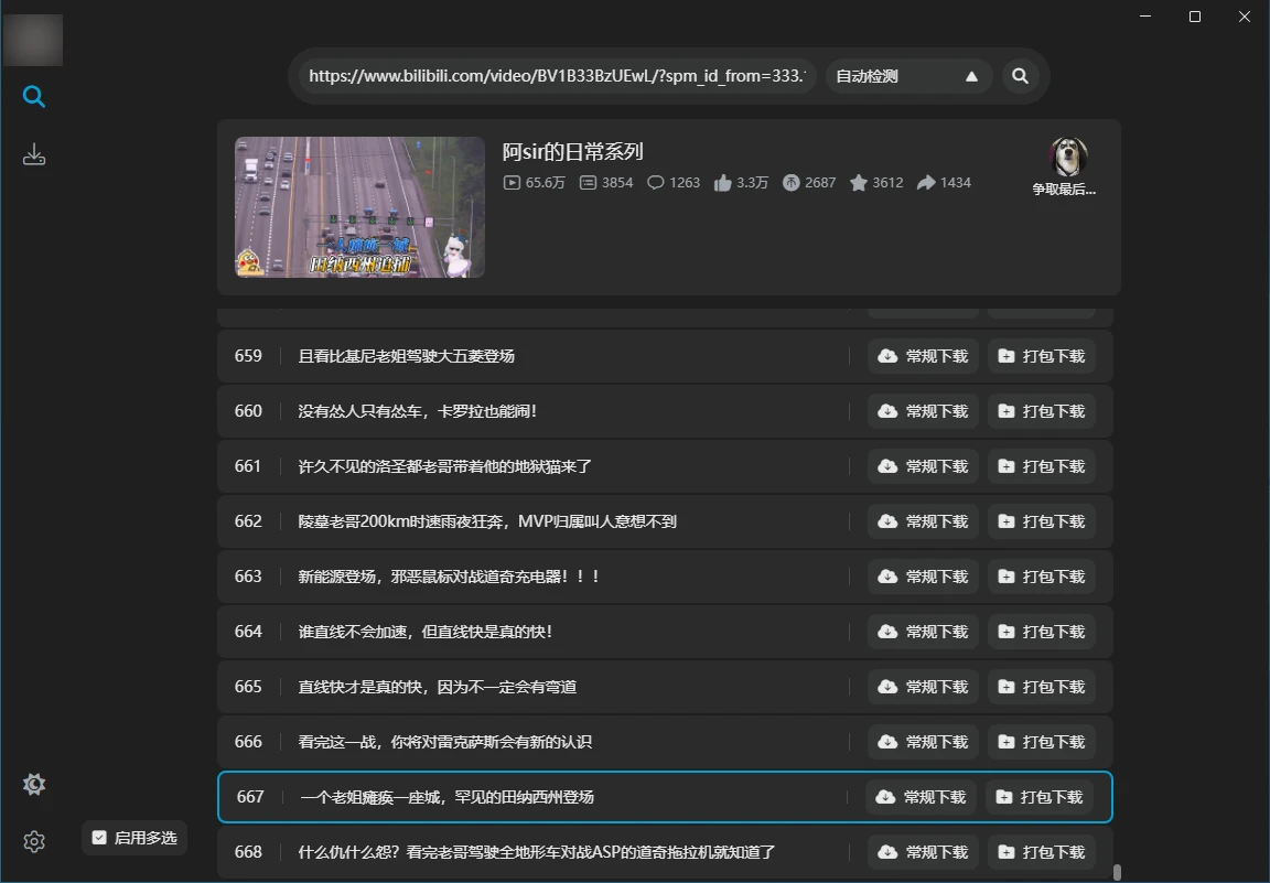 解析结果界面,你可以进行单选下载或者多选下载,针对需要多选的朋友可以看到上图中左下角有一个「启用多选」,将其勾选上就可以多选下载了: