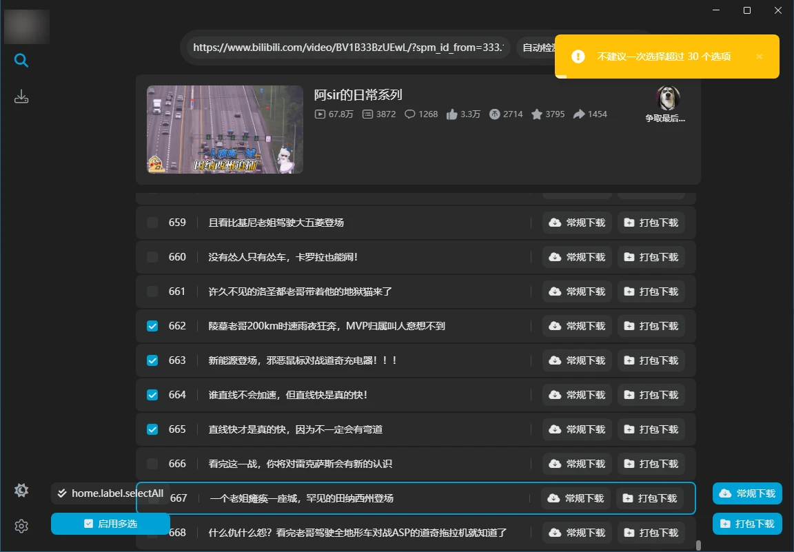 如上图所示,右上角的黄色内容提醒你不要选择超过30个视频,如果你想要下载的视频数量比较多,可以尝试分几次下载。「启用多选」上面还有一个英文的按钮,那个按钮就是所谓的全选,至于这里为什么显示英文可能是开发者忘记翻译了吧。
