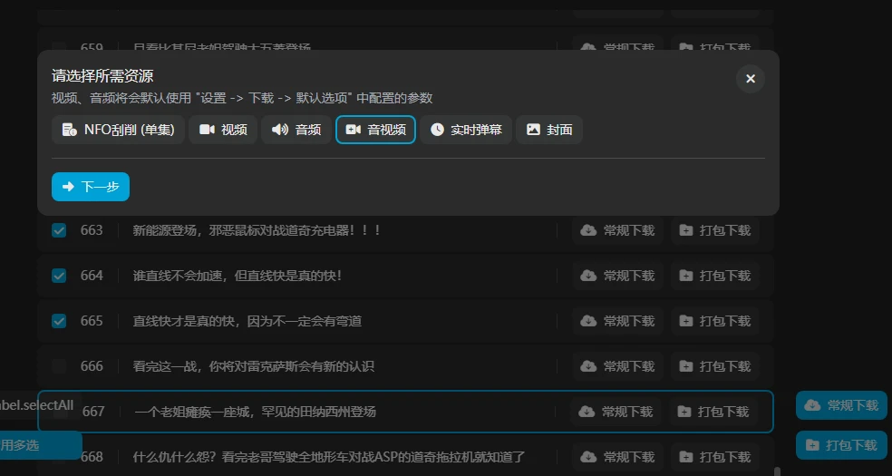 在你选中了需要下载的视频之后,右下角会有一个「常规下载」和「打包下载」按钮,两个按钮的区别在于常规下载可以更详细的进行设置,如下图: