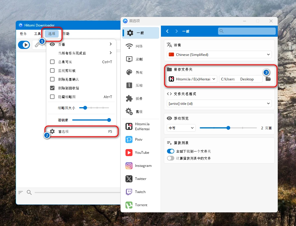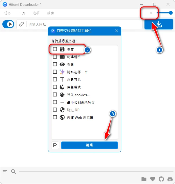 这个设置完毕之后,你可以在上图1️⃣号位置的左边看到一个保存按钮,这个保存按钮可以进行一切保存,包括设置、界面、下载列表都可以进行保存,如果你直接进行设置,它是不会自动保存的,必须要点击保存按钮或者切换到软件主界面,按「Ctrl+S」进行手动保存。