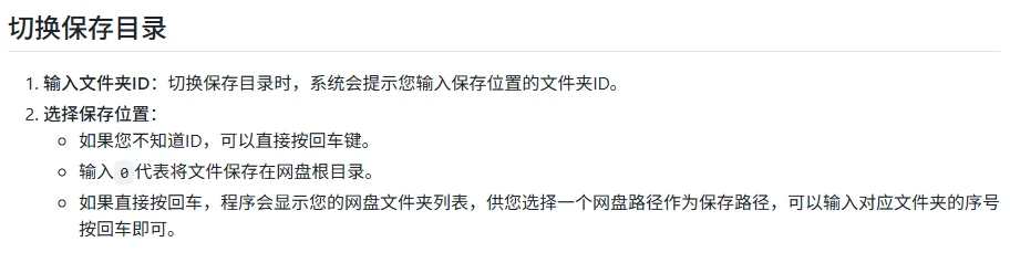 选项(3):切换保存路径。如果输入的ID为0,则代表保存在网盘根目录下。切换保存路径只支持根目录下的一级文件夹。