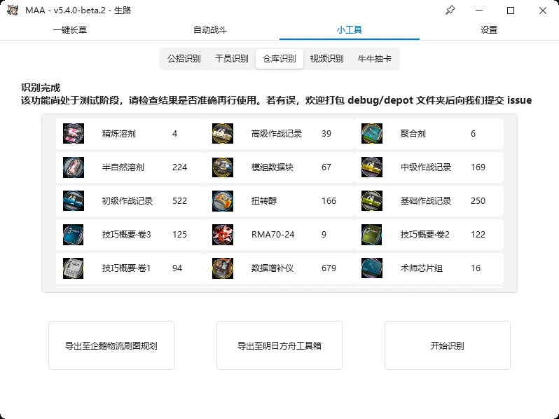 支持识别养成材料,并导出至 企鹅物流刷图规划、明日方舟工具箱、ARK-NIGHTS 干员培养表