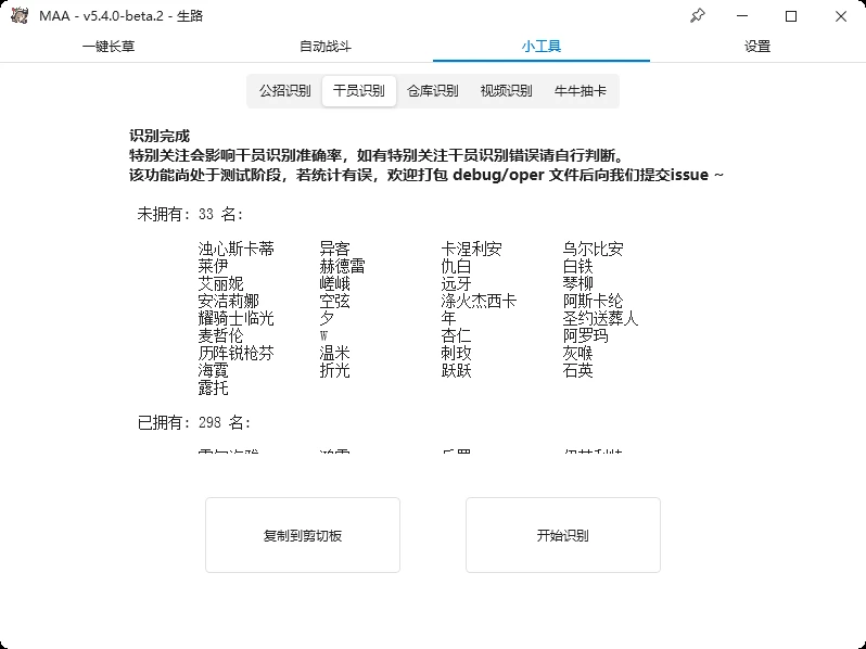支持识别干员列表,统计已有和未有干员及潜能,并在公招识别显示