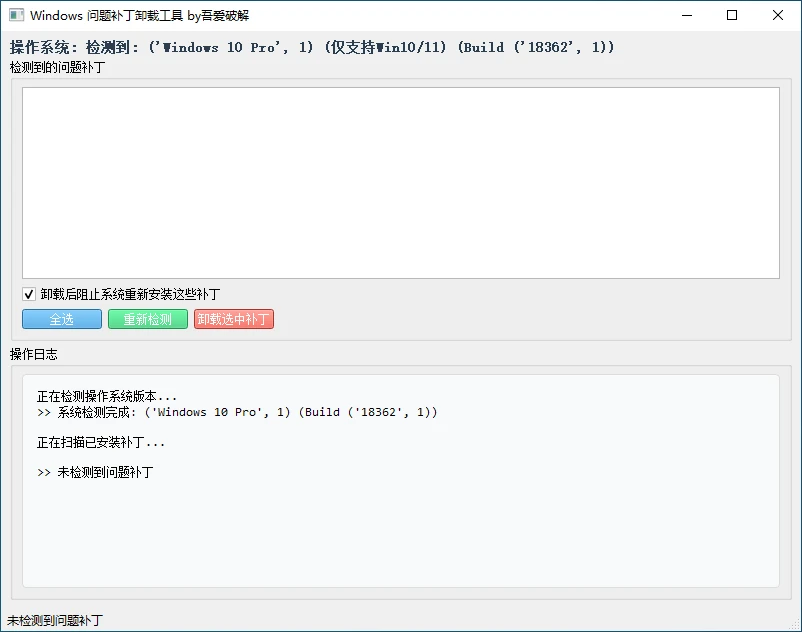 鉴于我这边没有安装相关补丁,所以这个界面就是空的,如果你安装了相关补丁,应该会有所显示,后续的操作就是选中补丁点击「卸载选中补丁」即可。