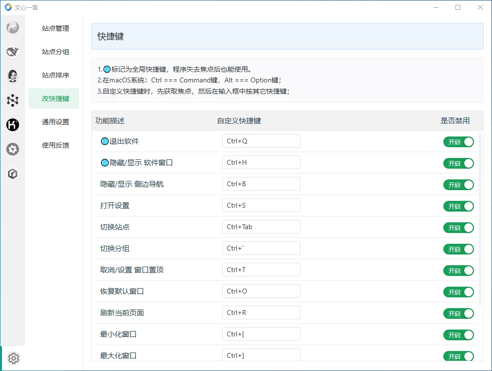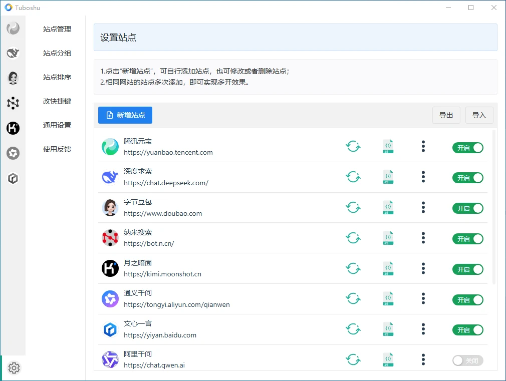 软件整体使用难度不高,基本上前期添加站点可能需要点时间,如果你有大量站点,可以尝试在「设置」中的「站点管理」界面中先点击「导出」之后按照相关格式编辑并且保存之后,点击「导入」按钮即可批量添加或者修改,更加快捷。