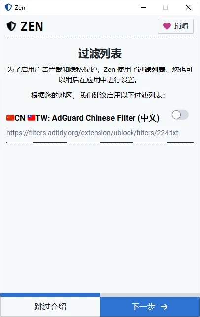 预装过滤器:Zen 预装了许多过滤器,用户还可以通过提供 Hosts 文件或 EasyList 样式的过滤器来添加自定义规则。