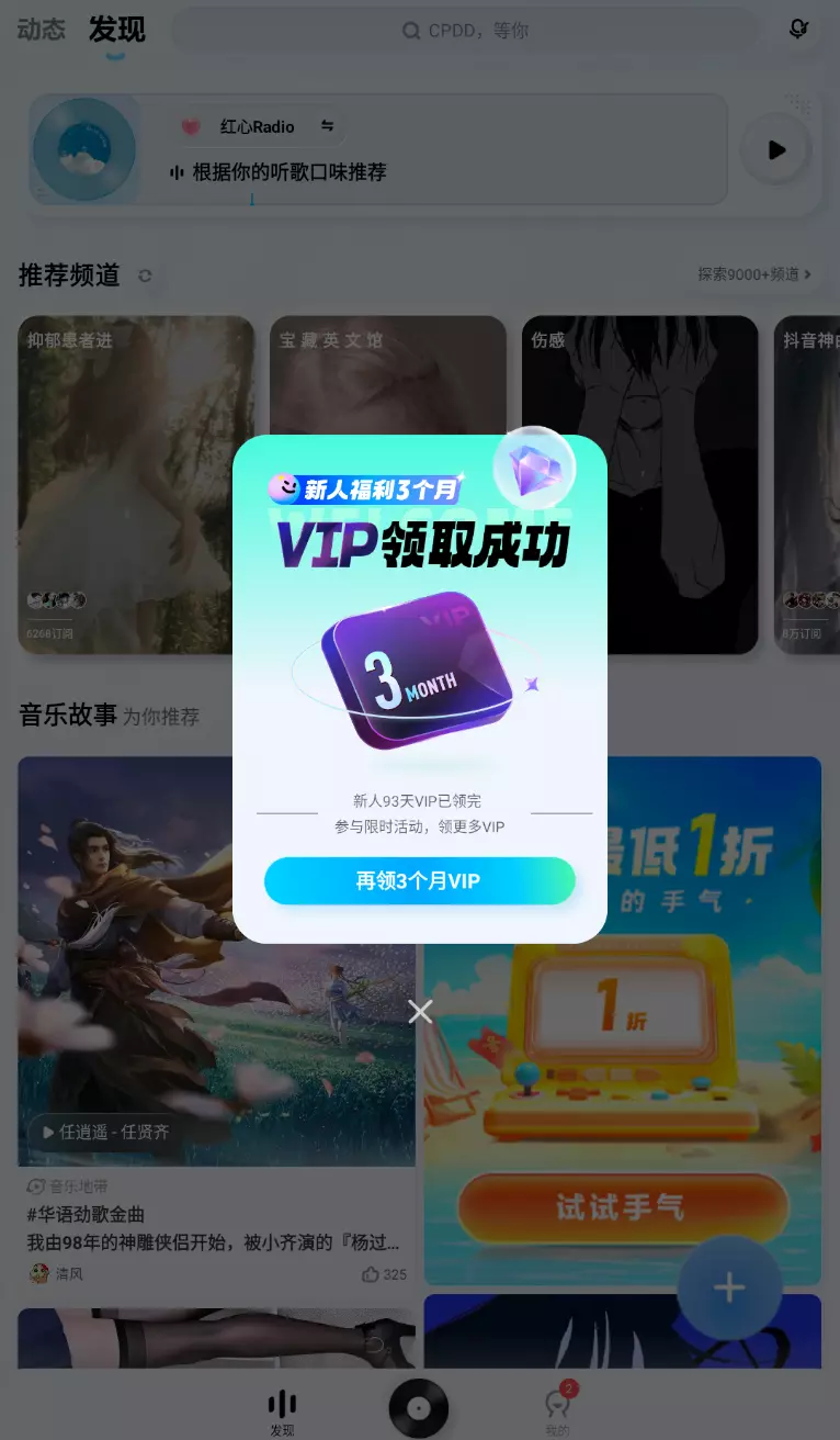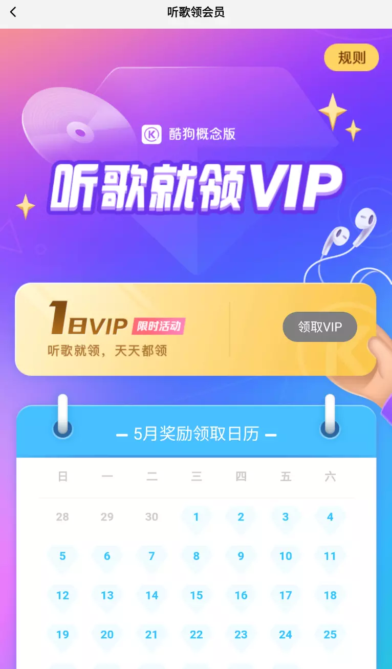 这个酷狗概念版本应该是酷狗最近才出来的,新用户可以直接免费获取三个月的免费使用期,还有一个更有意思的功能就是每天听一首歌就可以获取一天的VIP,这个措施基本就是增加用户粘性。