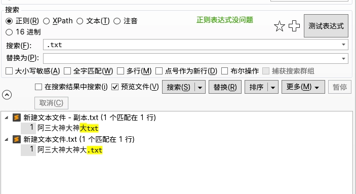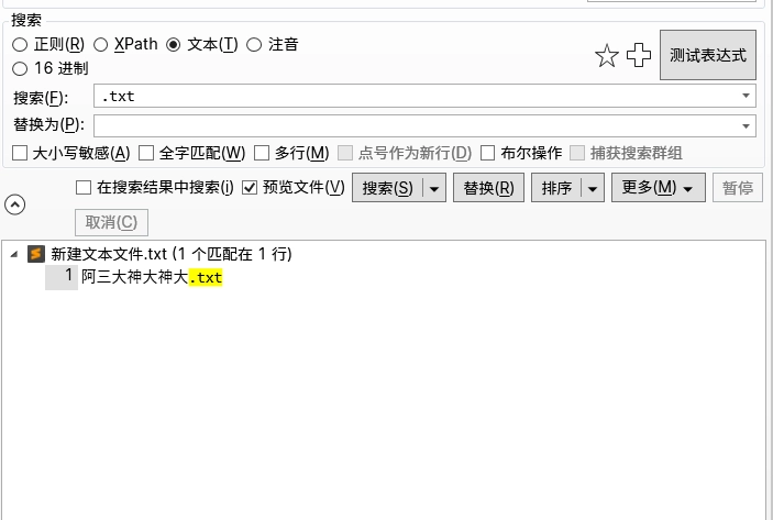 默认情况下,我个人推荐使用文本模式进行搜索。比如你的搜索内容是".txt",文本模式下,会搜索包含.txt的内容,但是如果是在正则模式下,则会搜索包含txt的内容,前面是什么内容都可以,具体表现如下: