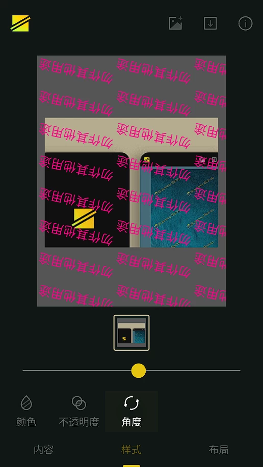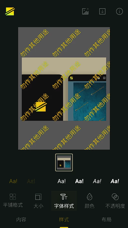 通过该界面我们可以看到功能分为三大类:内容、样式、布局。内容方面可以导入文字或者贴纸,两种情况,一般情况我们都是通过文字来添加的,有需要的可以添加贴纸作为水印素材: