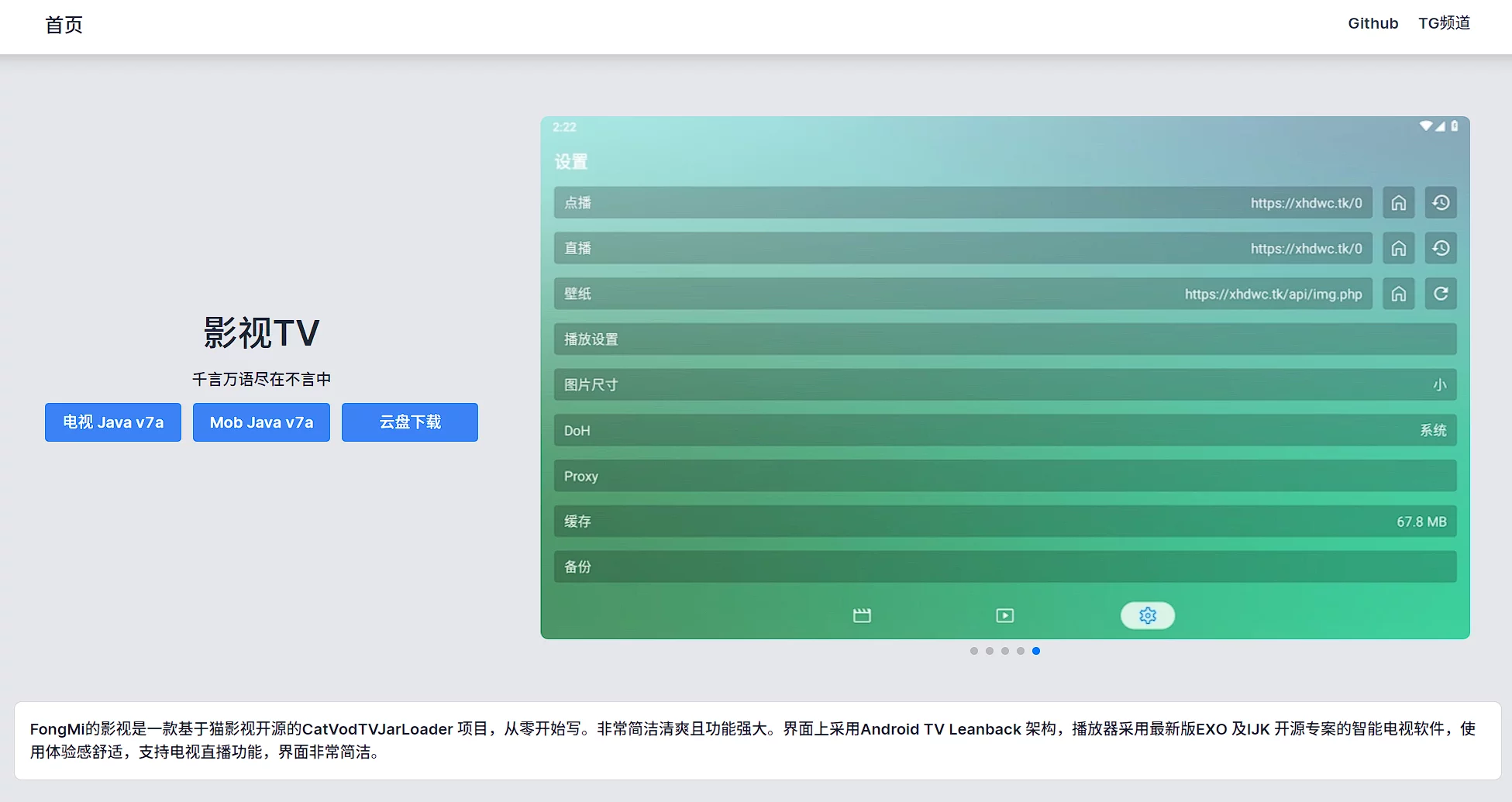 FongMi的影视是一款基于猫影视开源的CatVodTVJarLoader 项目,从零开始写。非常简洁清爽且功能强大。界面上采用Android TV Leanback 架构,播放器采用最新版EXO 及IJK 开源专案的智能电视软件,使用体验感舒适,支持直播的文章" style="text-decoration:underline;" href="https://xiangleshare.com/software?type=80" target="_blank" onclick="SubmitBtn('9dc7b77458','keyword','click-count','508-167','none','','','','','','none');">电视直播功能,界面非常简洁。
