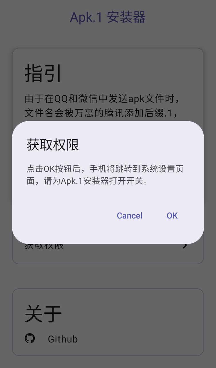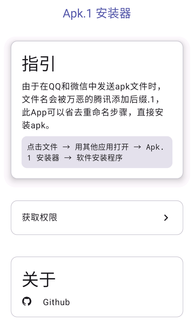 由于在QQ和微信中发送apk文件时,文件名会被万恶的腾讯添加后缀.1,此App可以省去重命名步骤,直接安装apk。