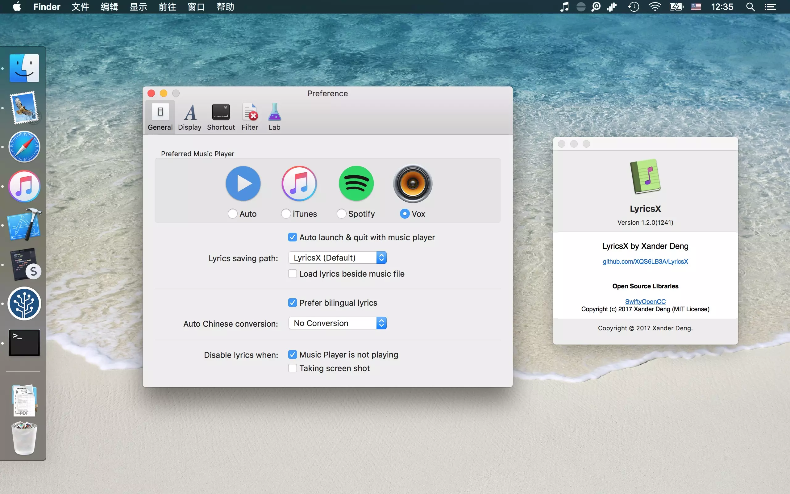 LyricsX主要使用Swift编写,能够显示和管理与当前播放音乐同步的歌词,支持主流的音乐播放软件,如iTunes, Vox, Audirvana, Spotify, Swinsian等。